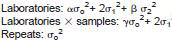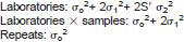 8.2.3.1 The degrees of freedom for the laboratories are (L' - 1). The degrees of freedom for laboratories x samples interaction are (L' - 1)(S' - 1) for a complete array and are reduced by one for each pair which is estimated. The degrees of freedom for repeats are (L'S') and are reduced by one for each pair in which one or both values are estimated.