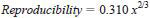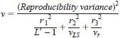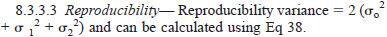 where the symbols are as set out in 8.2.4 and 8.3.2. The reproducibility estimate is the product of the reproducibility standard deviation and the"t-value" with appropriate degrees of freedom (see Table A2.5), corresponding to a two-sided probability of 95 %. An approximation (9) to the degrees of freedom of the reproducibility variance is given by Eq 39.