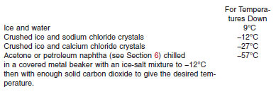 6.7 Bath or Baths, maintained at prescribed temperatures with a firm support to hold the jacket vertical. The required bath temperatures may be obtained by refrigeration if available, otherwise by suitable freezing mixtures. Freezing mixtures commonly used for temperatures down to those shown are as follows: