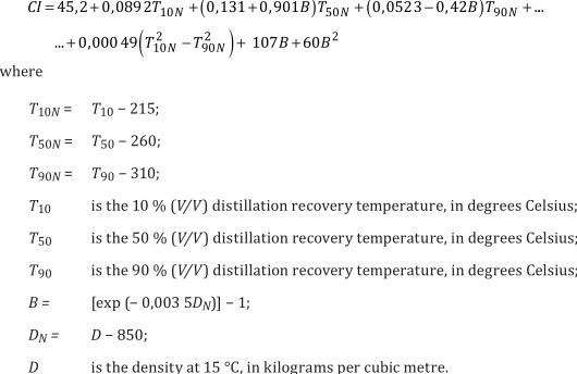 Insert the measured values (see 5.1 and 5.2) in Formula (1) below and calculate the cetane index, CI: