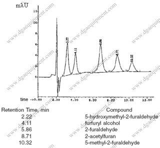 HPLC is a form of column chromatography. It utilizes a column that holds chromatographic packing material (stationary phase), a pump that moves the mobile phase through the column, and a detector that shows the retention times of the molecules. Components to be analyzed are first dissolved in a solvent, and then forced to flow through a chromatographic column under high pressure. The mixture that resolved into its components is detected by UV spectrometer. Sample result of furan measurement by HPLC is shown as follows. The time at which the peak occurs in the corresponding chromatograms indicates the existence of the particular furan derivatives available in the oil sample.